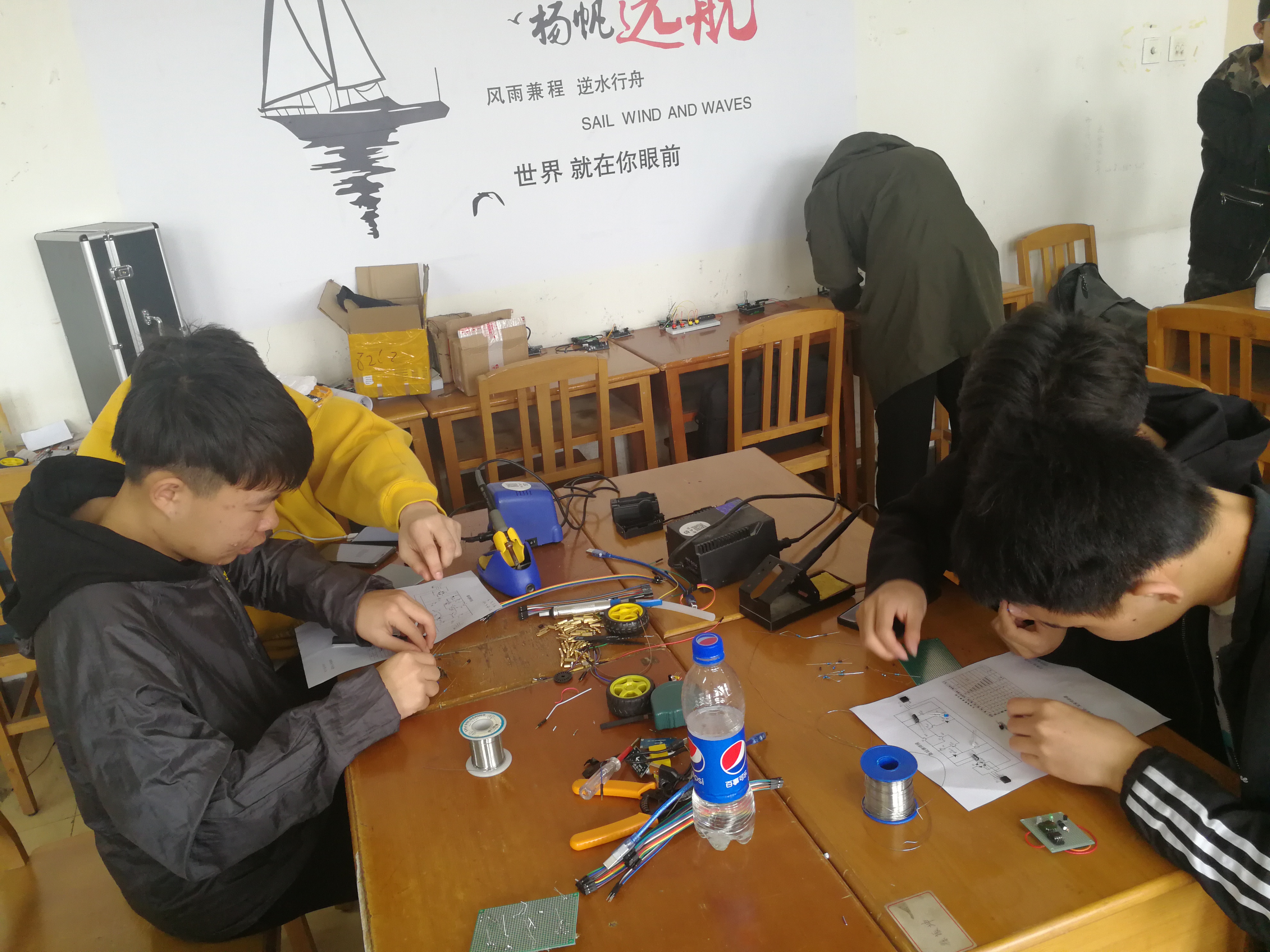 彭一准老师担任指导,学院新电社主席团成员担任赛前培训、赛事组织与裁判工作。比赛从上午9点持续到下午17点,历经焊接、编程、作品分析,现场问答等环节 |
